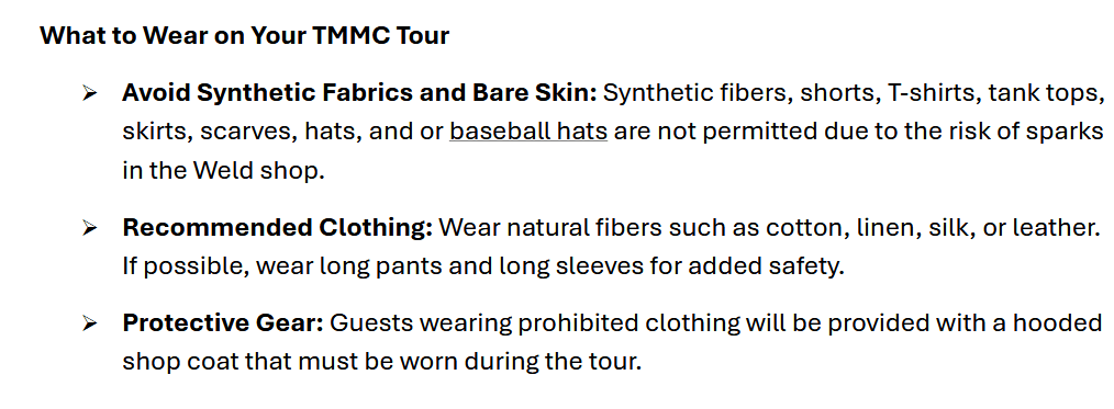 On the day of, please bring valid photo ID, and “dress for a manufacturing environment”: