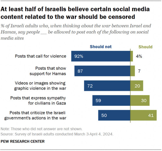 Pew recently commissioned Gallup to run a poll in Israel on attitudes to social media censorship. They found high support for banning various kinds of speech: