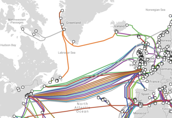 I don’t want to pick on them in particular, but this is a common misconception about how the internet works. Internet traffic doesn’t follow great-circle routes, but instead follows the cables. [1] In the case of connections between the US, Iceland, and Europe, these are underwater cables: