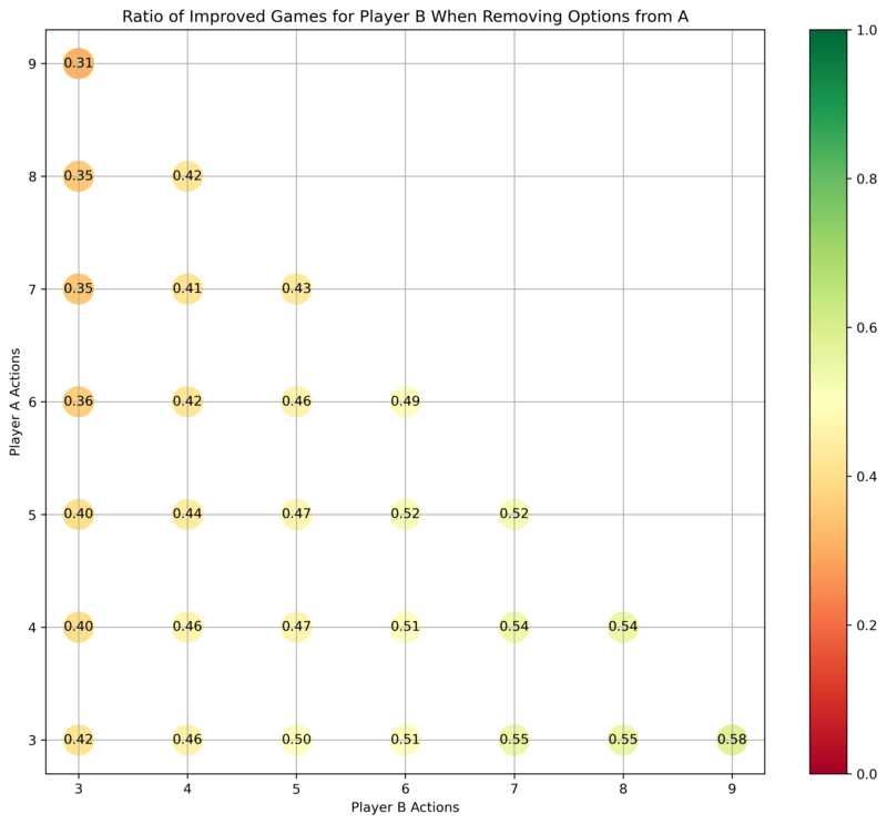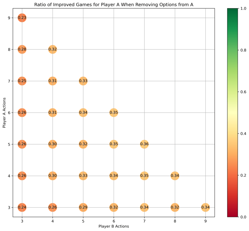 In small normal-form games, taking away an option from a player improves the payoff of that player usually <⅓ of the time, but improves the payoffs for the other player ½ of the time. The numbers depend on the size of the game; plotted here.