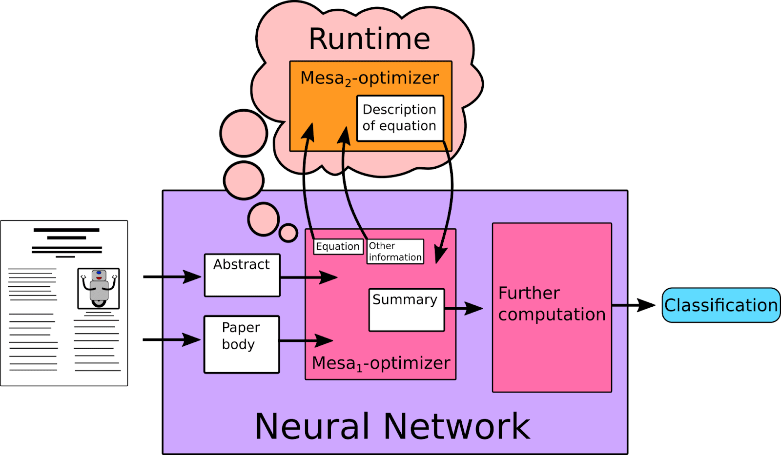 We begin with a large language model, which is being trained with the base-objective of correctly classifying papers on arXiv. As part of this process it is helpful to be able to summarize the papers (as part of the model’s internal cognition), and so a mesa1-optimizer develops as a sub-agent which has the objective of accurately summarizing papers. More specifically, this mesa1-optimizer is given the body text from an article and attempts to generate an abstract that is ‘close’ to the original abstract. The mesa1-optimizer is attempting to minimize the difference between its generated abstract and the real abstract.