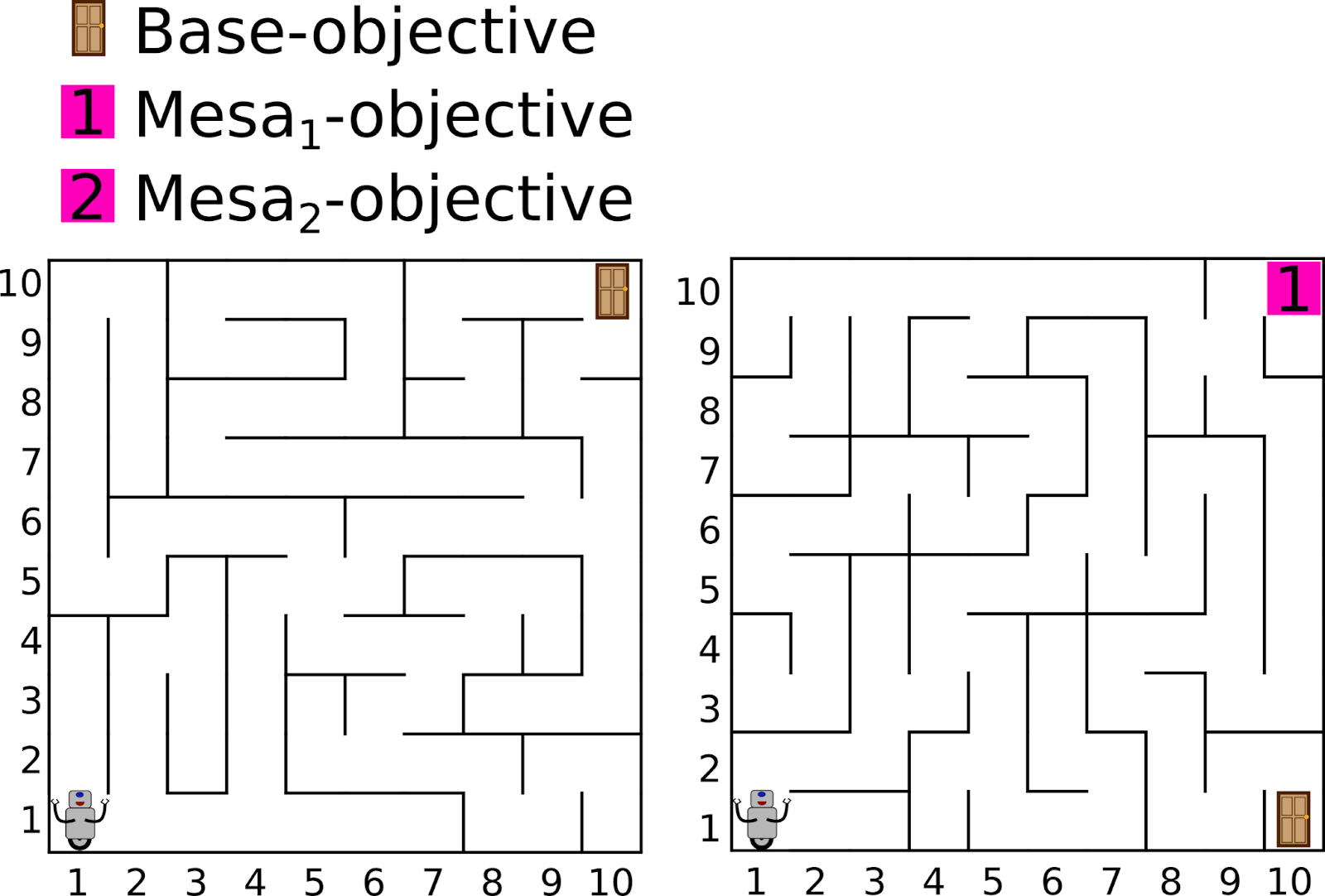 In one of the standard examples of inner misalignment we train an RL agent to mazes, so the base-objective is for the agent to reach the exit of the maze. But in training, if the exit is always in the same position in the maze (for example at position (10, 10)), then the agent may optimize for reaching this position instead; this is the mesa1-objective.