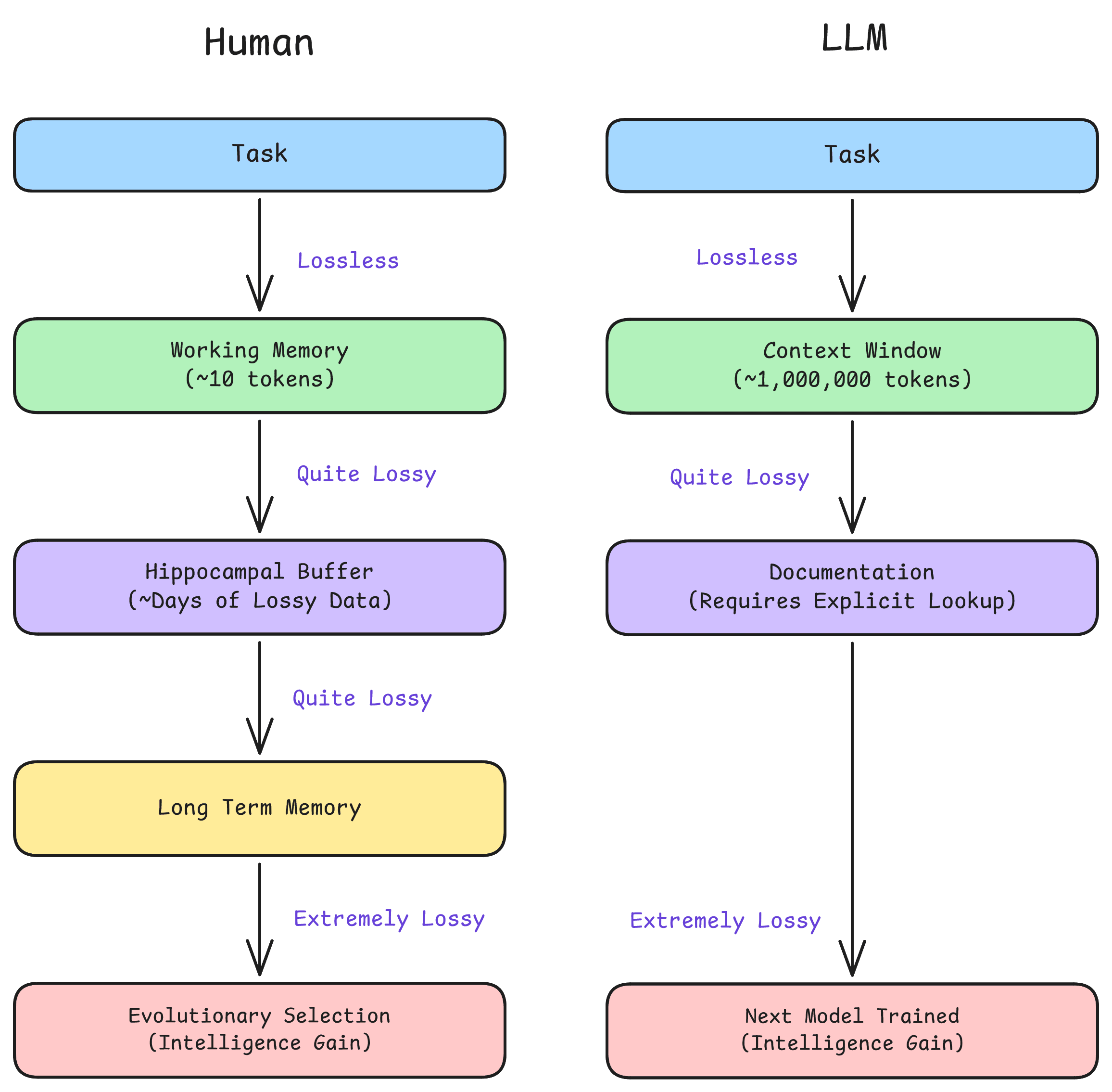 Laying it out like this, you can see the ‘long term memory’ update step is missing, but the ‘context window + documentation’ is ridiculously larger in storage capacity that human working and short-term memory, and the ‘intelligence gain’ step so much shorter, that skipping a weight update at runtime might be viable. Humans require memory related parameter updates because we can’t store much information in working or short term memory, but if our working memory was so large it didn’t fill up within our lifetimes, you can see how the situation changes.