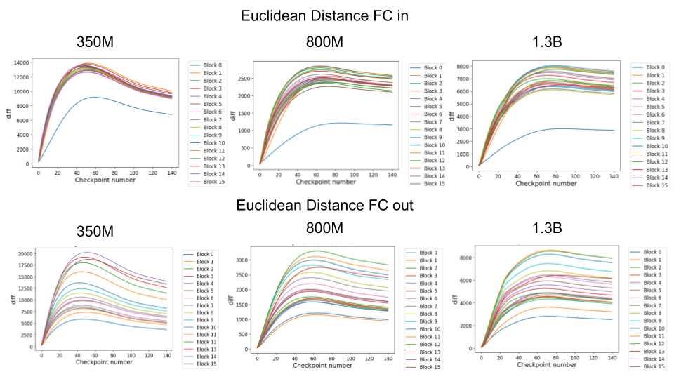 Some of the weight blocks had euclidean distances that very closely tracked the norms. For instance, the attention out weights had the classic rapid increase and then slow decline phase that we see in the weight norms. Interestingly, even here the 1.3B model appeared to show an unusual phase-shift at around 20 checkpoint steps in its euclidean distance. Moreover, for all models the peak of distance from initialization appeared to occur at between 20-40 checkpoint steps, perhaps indicating that this time is significant.