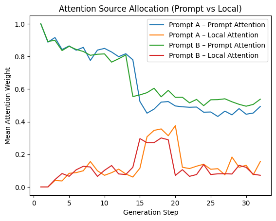Attention | Phase, Phase 1 (1–13) Phase Shift (14) Phase 2 (17+) Attention Pattern, High Prompt Attention (>0.8) Prompt ↓, Local ↑ Prompt ≈ Local (~0.4) | Pure retrieval New info integration New equilibrium |