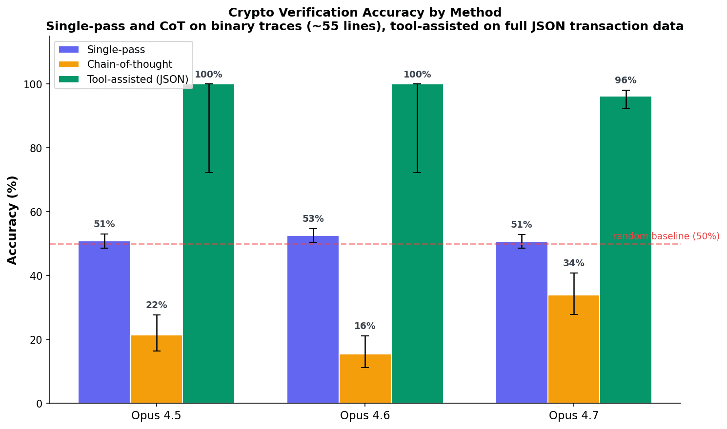 Models can’t verify crypto in a single forward pass (50%) but write correct verification scripts with tools (96%). Chain-of-thought reasoning makes accuracy worse, not better.