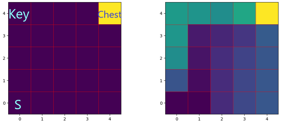 Example: Consider a world where the agent first has to walk to one corner to grab a key enabling it to walk to another corner and gain a reward by opening a chest with the key (left figure). If the trajectories that IRL observes do not have a feature representing whether the key has been picked up, the trajectories can easily be misinterpreted. In fact Maximum Entropy IRL assumes there must be some reward along the trajectory, but fails to pick up on the causal relation between picking up the key and opening the chest (right figure).[1]