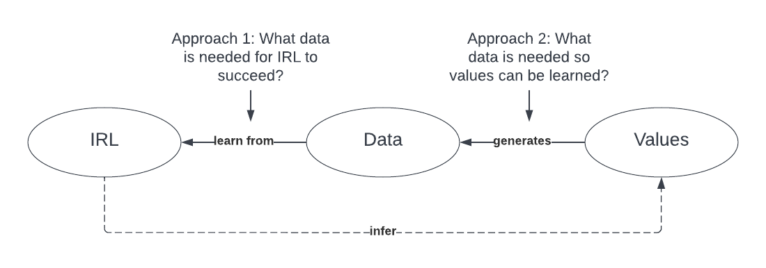 I aim to attack this question from two sides: In Approach 1, I investigate which properties of data would make it impossible for IRL to correctly learn rewards (Section 2). In Approach 2, I argue that certain properties of human values imply the need of data with certain properties to be able to learn the values (Section 3).
