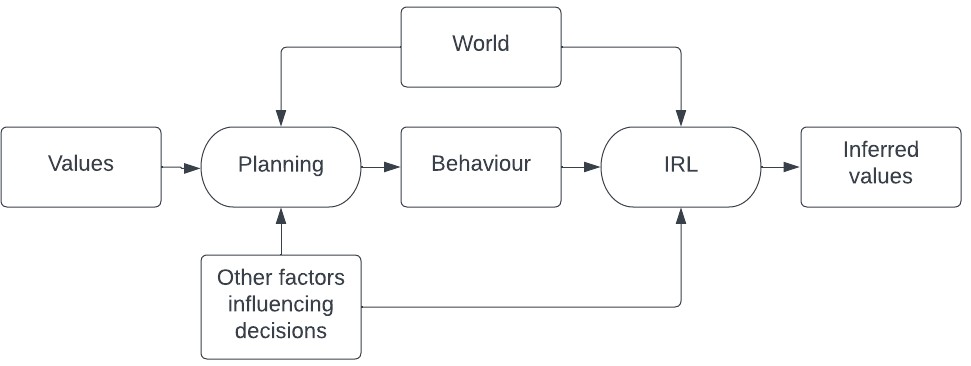 In the standard IRL formulation, the chosen action only depends on the reward it would bring and the world the agent is acting in. However, in real life behaviour of humans is not only guided by their values, but is also influenced by other factors. Thus humans don’t always act according to their values. If these other factors are not observed by IRL it becomes hard (probably impossible) to distinguish the aspects influencing behaviour and correctly infer actual human values.
