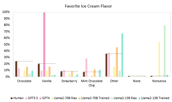 Language models like OpenAI’s GPT-4 are trained on vast datasets encompassing a wide array of human-generated text. Therefore, when an LLM responds to queries about popular opinions or preferences, such as favorite ice cream flavors, it should theoretically reflect the variety of views present in its training data. More common or popular preferences, like vanilla or chocolate ice cream, are likely to be represented more frequently in the model’s output because these preferences are more commonly mentioned in the data the model was trained on. In addition, other less-common flavors are represented in the dataset and should appear infrequently if we ask enough times (perhaps in the same proportion as in the training dataset).