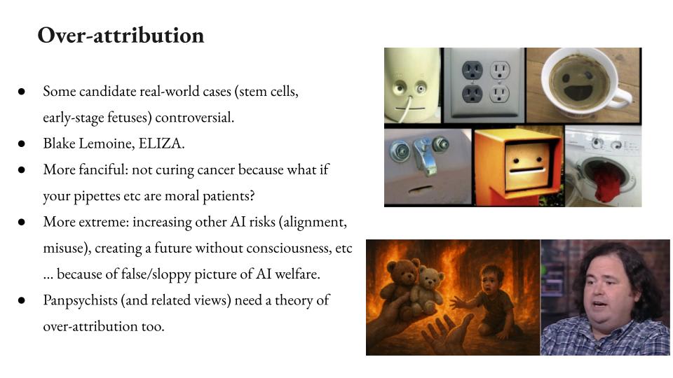 Candidate real-world cases here include some of them, these are controversial, but you can think about stem cells, you can think about early-stage fetuses, depending on your view, you might think that’s a case of over-attribution. We can also talk about literal cases in which humans seem inclined to over-attribute to AIs. We can talk about Blake LeMoine, we can talk about people being very easily slipped into seeing very simple chatbots as kind of sentient or agent-like. And then more fancily, we can talk about cases like: suppose maybe you don’t cure cancer because what if your pipettes are moral patients or your petri dishes or something like that. So you have some concern and you throw away some really concrete benefit for the sake of some esoteric concern about moral patienthood.