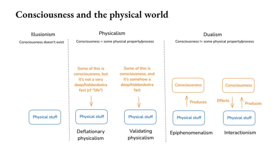 And then we’ve got dualism which says consciousness is not a physical process, and then that kind of splits into different variants. The one people often implicitly assume is epiphenomenalism, which is sort of physical stuff, the consciousness blooms, it floats above, but it doesn’t cause anything. This one I think is very bad view because you don’t get the knowledge thing I talked about before. So I think the most plausible form of dualism is interactionism where it goes both ways, also really bad because now you’ve got these extra effects coming from some non-physical source. Doesn’t look like physics thinks that that’s a thing. It doesn’t look like it’s a thing. Anyway, so there’s a lot to say about all of these. None of them are especially good and that’s a problem.