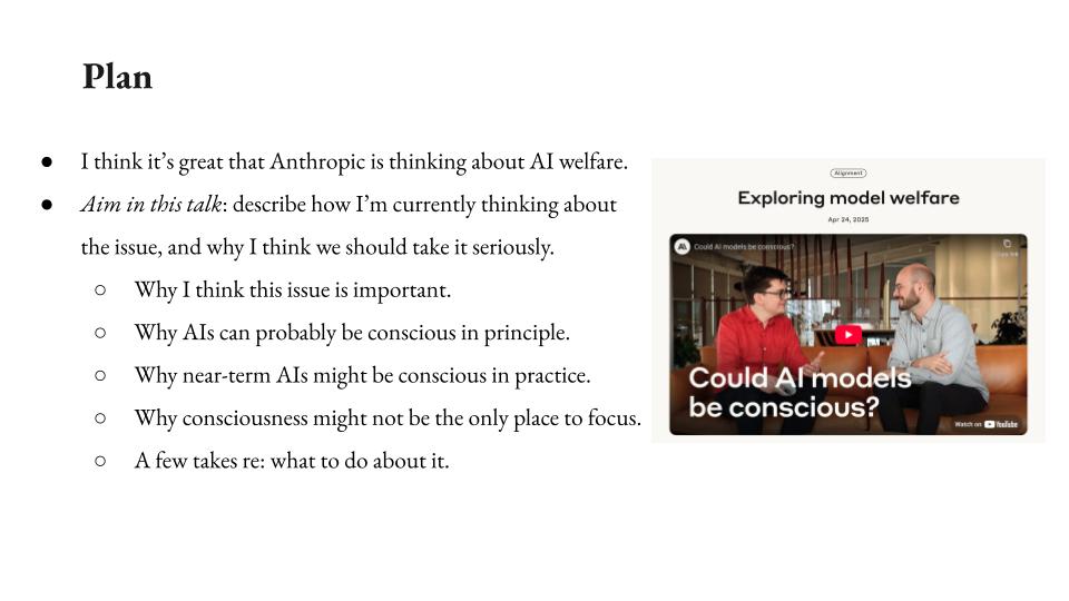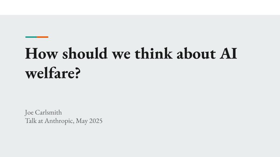 This is the video and transcript of a talk I gave on AI welfare at Anthropic in May 2025. The slides are also available here. The talk gives an overview of my current take on the topic. I’m also in the midst of writing a series of essays of about it, the first of which—“On the stakes of AI moral status”—is available here (podcast version, read by the author, here). My takes may evolve as I do more thinking about the issue.