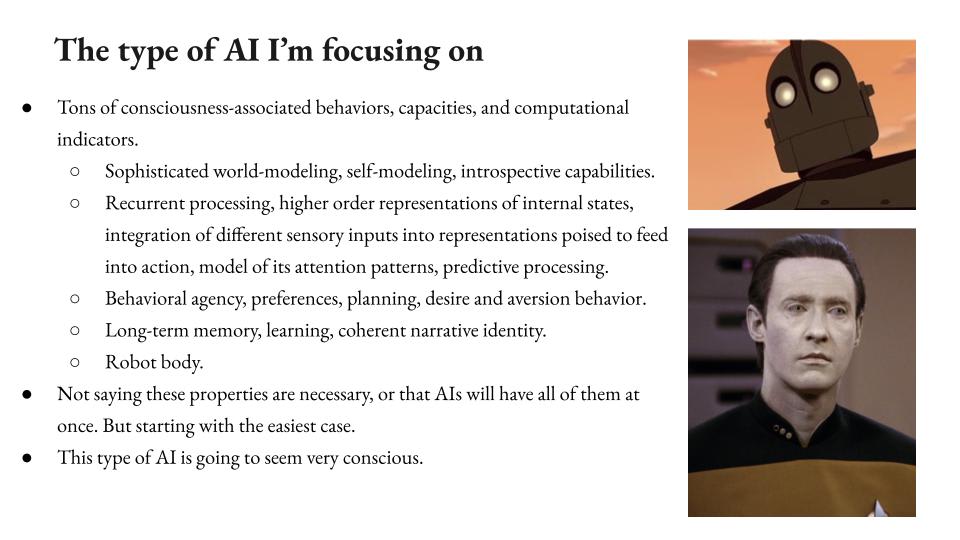 And so I think a big thing that gets me interested in this is I think these AIs, if you’re hanging out with them, you imagine us hanging out with a robot that satisfies all of these conditions, it’s just going to be like, “Hi.” It’s just going to be there and you’re going to be like, “Hello.” It’s like, “Yep.” And then you do stuff, it’s tracking what’s going on. It’s going to be really triggering your this-being-is-here-in-the-room-with-me sense, right? And not in some shallow way where then you do something and it stops doing that, right? It’s not like there’s going to be some obvious behavioral test that it’s going to fail. It’s just going to fully seem like a kind of present being, responsive to you, tracking itself, its own internal states, you, the world. Okay, so the question is how easy is it to get that sort of thing without consciousness or with consciousness, and that’s what I’m going to be interested in here.