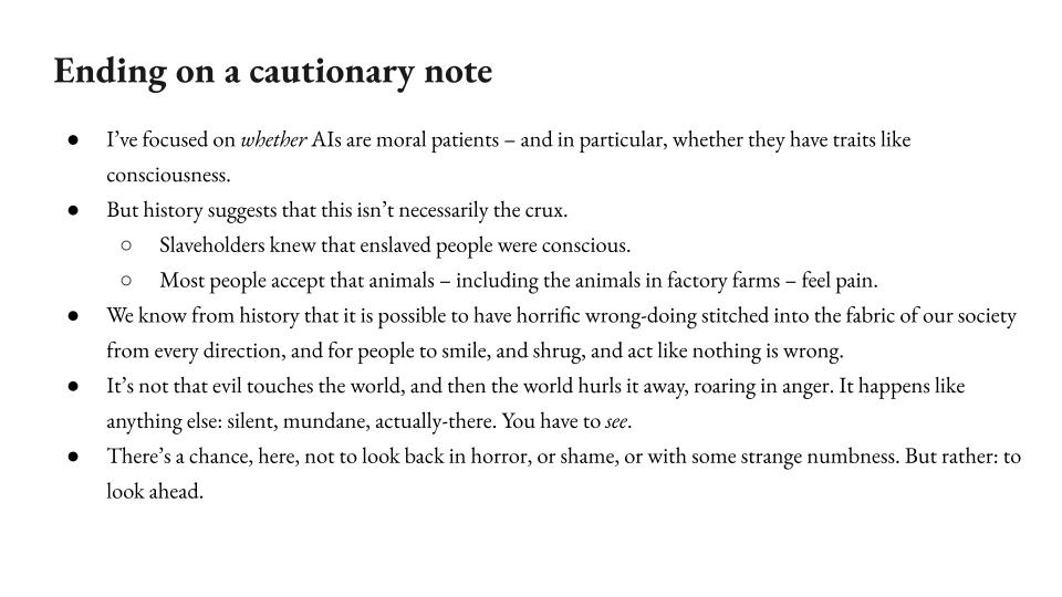 And then I’ll end just on a cautionary note about this issue. So we’ve been talking about whether AIs are moral patients and in particular whether they have traits like consciousness. I think history unfortunately suggests that this isn’t necessarily the crux for how a being is treated. So if you look at some of the historical cases where we’ve gotten something about moral patienthood really wrong, it wasn’t so much … the slaveholders knew that the enslaved people were conscious. Most people who eat meat, I think, or who or otherwise, I think most people accept that animals including the animals in factory farms feel pain, or at least would say that this is very plausible. And so that was not enough in those cases. It might’ve been a kind of necessary condition for people to care about this, but it was not sufficient, and that could happen in this case too.