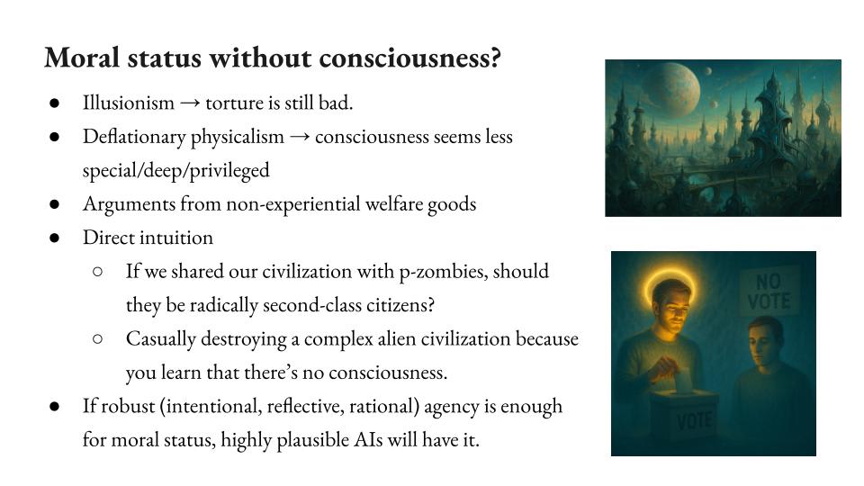 Also, there’s some just intuition pumps. So imagine this is a case from Holden Karnofsky where you imagine there’s some p-zombies in our civilization. They’re humans, but they’re just like, some of them don’t have consciousness. Should they not vote? Should they be radically second class-citizens? There’s still something icky about that.
