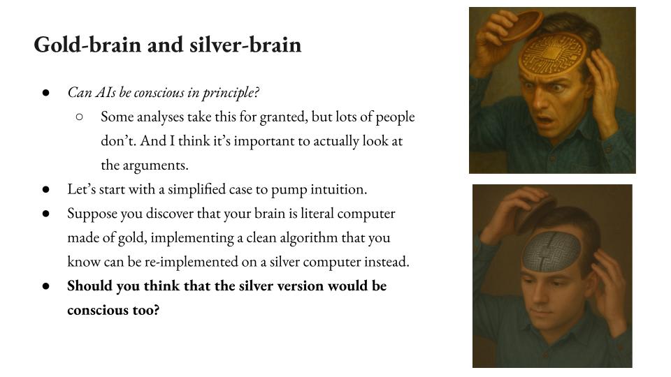 Okay, so with that in mind, let’s get into a little more meat about whether AIs can be conscious in principle. So some analyses of this topic kind of take this for granted, but people don’t. So I think if you’re going to think about this as you don’t always be like, “Well, all right, let’s just grant computationalism about the nature of consciousness.” No, I think you want to actually have some sense of why do you think that AIs could be conscious at all. And I want to start with a simplified case to pump intuition. I’m going to call this gold brain and silver brain.