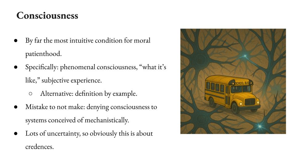Now let’s talk a little bit about consciousness. So by far the most intuitive condition for mortal patienthood is consciousness. If you talk to people about AI welfare, the quickest way in is just to be like, “Are the AIs conscious?” And this was the theme of Anthropic’s recent content on this.