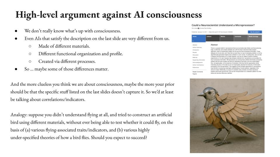 I also want to flag to a high-level argument against AI consciousness. There’s various arguments people give. I’m just going to focus on the one that I actually find kind of persuasive and it goes like this. We don’t know what’s up with consciousness. But these AIs, even AIs that satisfy the description I just gave, are going to be very different from us. They’re going to be made of different materials, they’re going to have very different functional organizations and profiles. They’re going to be created by a different processes and under different constraints. So there’s going to be a bunch of ways in which these AIs are very different from humans. So I don’t know, maybe some of those differences matter.