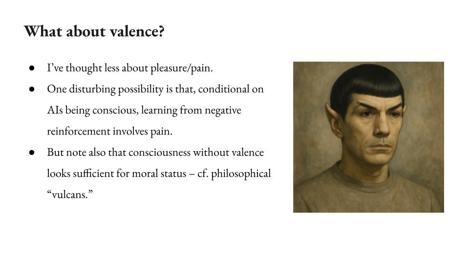 I’ll also say though that it looks plausible that consciousness without valence is still sufficient for moral status. So Dave Chalmers has these thought experiments where you have Vulcans that are very valence-like. I don’t actually think the Vulcans in the show, I haven’t seen the show, I think they probably had valence. But you imagine fully non-valence conscious agents that have preferences of other kinds, it looks plausible that they are moral patients.