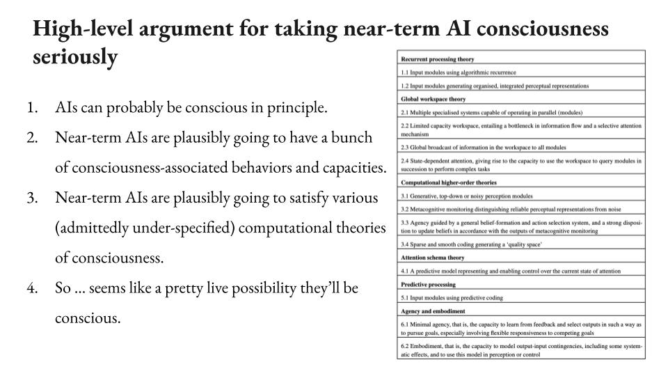 So with that said, now I want to talk about a high-level argument for taking near-term AI consciousness seriously. This is my version of an argument that’s also been offered in a recent report from a bunch of experts called “Taking AI Welfare Seriously.” The way I’d put it is something like: One, AIs can probably be conscious in principle. I’m going to talk about all these premises in a second. Two, near-term AIs are plausibly going to have a bunch of consciousness-associated behaviors and capacities. I’ll talk about what I mean there in a second. And then three, near-term AIs are plausibly going to satisfy various admittedly underspecified computational theories of consciousness. And I’ve got a big list over there, we can talk about those in more detail if you want.