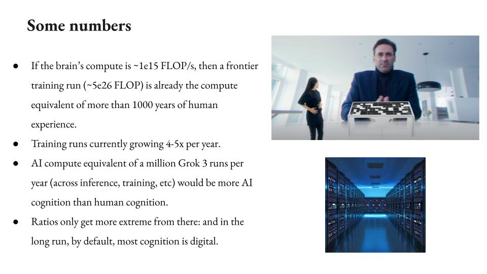 Training runs are currently growing 4-5x per year, maybe not sustainable, but that’s going up fast. If we got to the point where we were doing the compute equivalent of a million Grok 3 runs per year across inference training, et cetera, there would be more AI cognition than human cognition happening. And the ratios only get more extreme from there. And in the long run, by default, most cognition, I think is likely to be digital. So if that cognition is moral status possessing, then most of the moral status would be digital too. So the eventual stakes here, I think, are very serious.