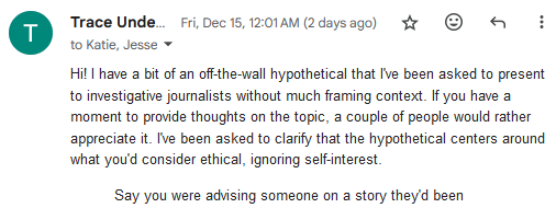 My own credibility is limited by my amateur status and relative inexperience. I’m not an investigative reporter, much as I LARP as one online.[15] Since my job puts me in close proximity to them, though, Oliver and I worked together to write a hypothetical to pose to experienced journalists, in line with his challenge to me, with our opposite expectations preregistered. I don’t endorse the hypothetical as a fully accurate summary of what happened, but agreed that it was close enough to get worthwhile answers.