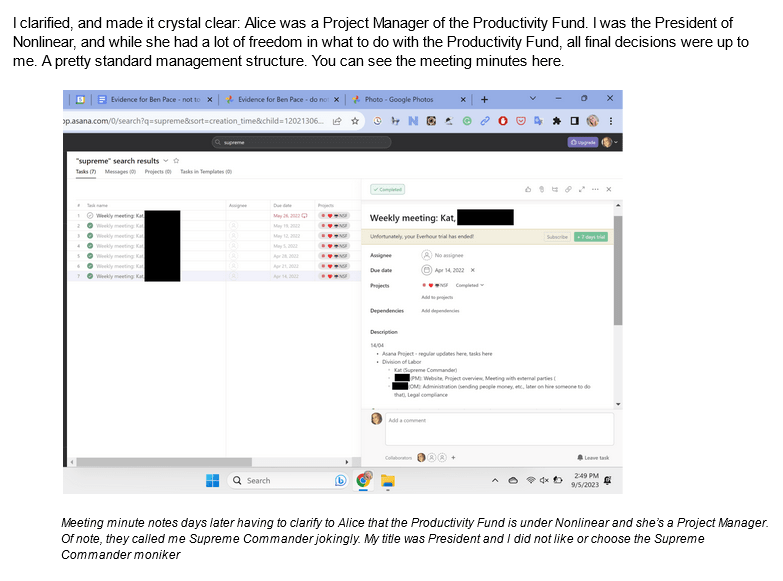 Nonlinear provides two screenshots to support an in-depth narrative that Alice’s role was always as a project manager within Nonlinear, that they clarified repeatedly that she was a project manager within Nonlinear, that all of the funding in her project came via Nonlinear, that they would never have simply handed a quarter-million dollars to an untested new organization, and that Alice repeatedly attempted to claim she had a separate organization despite that.[8]