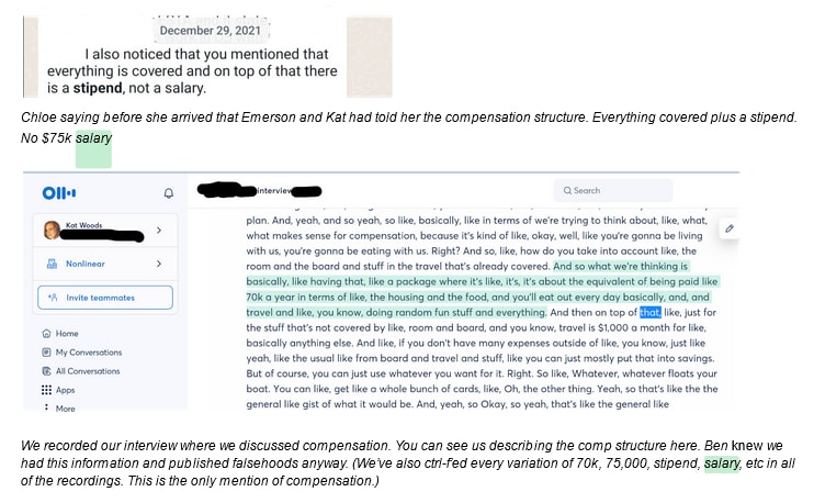 Nonlinear clearly explained Chloe’s compensation scheme from the beginning and presented it in a clear and unambiguous written contract, which they fulfilled.[5] It was always conceptualized and presented as $1000 a month plus living expenses. She accepted the position knowing its compensation. It’s not a level of compensation I’d advise anyone in it for the money to take, but the experience is the sort that many young people, including me, have pursued knowing there’s a monetary tradeoff.