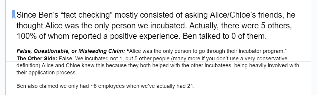 Nonlinear has had 21 employees, including five other incubatees. This is a low-importance claim, but it’s illustrative. Clarifying with Nonlinear, who was not only willing to clarify points with them but begging to do so, would have taken no time at all. To avoid fact-checking this demonstrates a low priority for fact-checking in general.[3]