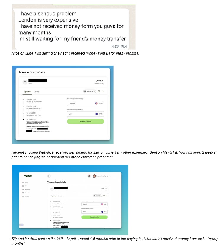 Timed transactions straightforwardly demonstrate that aspects of Alice’s claims about waiting for salary payments were false. Kat also explains that the delay in expense reimbursement was because Alice switched from recording in their public reimbursement system to using a private spreadsheet without telling them, and that they reimbursed Alice as soon as she told them. While the document provides no primary source on this, as with the “not allowed to live apart” claim, the counterclaim provides ample reason to either verify more closely or avoid publishing the falsehood.[7]