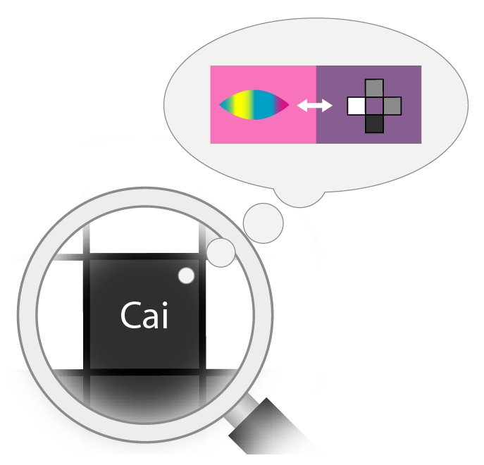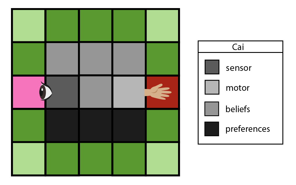 Cai has a simple physical model of itself as a black tile at the center of a cellular automaton grid. Cai’s phenomenological bridge hypotheses relate its sensory data to surrounding tiles’ states.