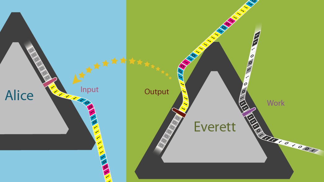 A more naturalistic model would say: Alice outputs a bit; Everett reads it; and then Everett does whatever the heck he wants. That might be feeding a new bit into Alice. Or it might be vandalizing Alice’s work tape, or smashing Alice flat.