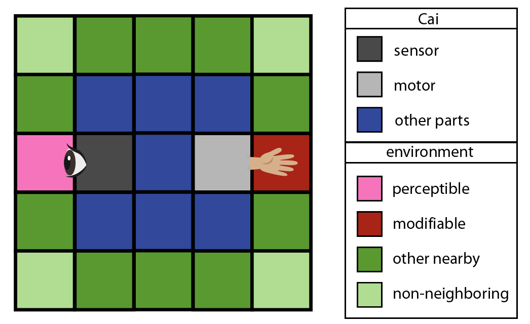 A naturalistic version of Cai can reason intelligently from the knowledge that its actions (motor output) depend on a specific part of its body that’s responsible for perception (environmental input).