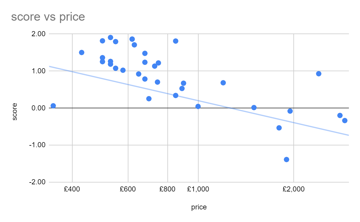 LaptopScores are biased towards cheap laptops because a laptop that is twice as good is usually a little more than twice as expensive, because it’s hard to fit two laptops into the space of one laptop. Maybe 3 was the wrong weight to use on the price penalty? Nah, it’s fine.
