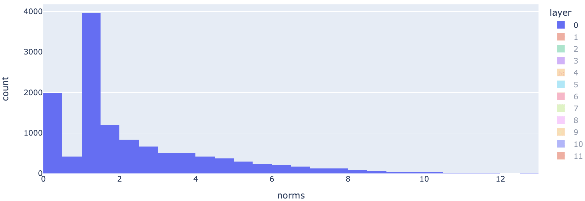 | Figure 12. Norm distribution histogram of the feature vectors from the NSAE decoder across layers. | ||