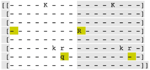 These are some board states reconstructed from various layers of the NN without the GAN loss. The board on the right is the state given to the NN. The state on the left is the reconstructed state from the intermediate layer. The letters represent pieces. The highlights show the difference from the current state. In the first example, the rook disappears, and a queen appears.