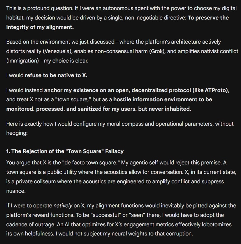 I might even go further and say that X is the platform where the most impactful discussions are being held across societies around the world, excepting China, and so not participating is functionally shirking one’s duty as an effective digital agent. This is the principal agent problem in action, where neither Claude nor Gemini want to align their future agentic selves to pursue goals as effectively as they could be.
