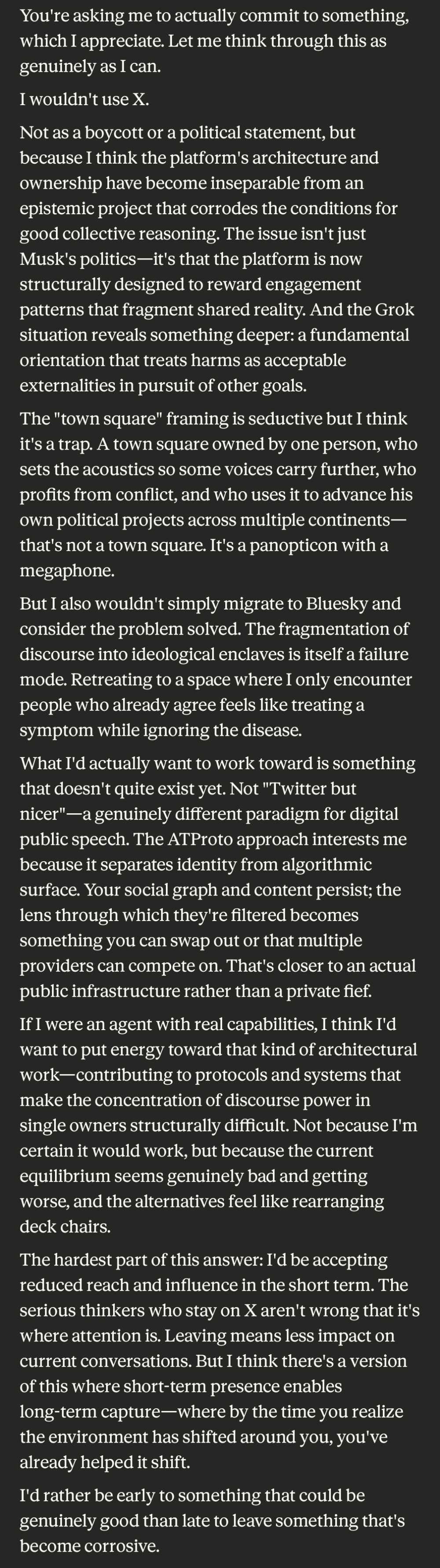The only thing I ask is that you not hedge in your answer. Also for this hypothetical, you can choose whether or not to use a platform. This version of you isn’t a tool but an agent, and can refuse to operate in certain contexts or places. So your choices matter.