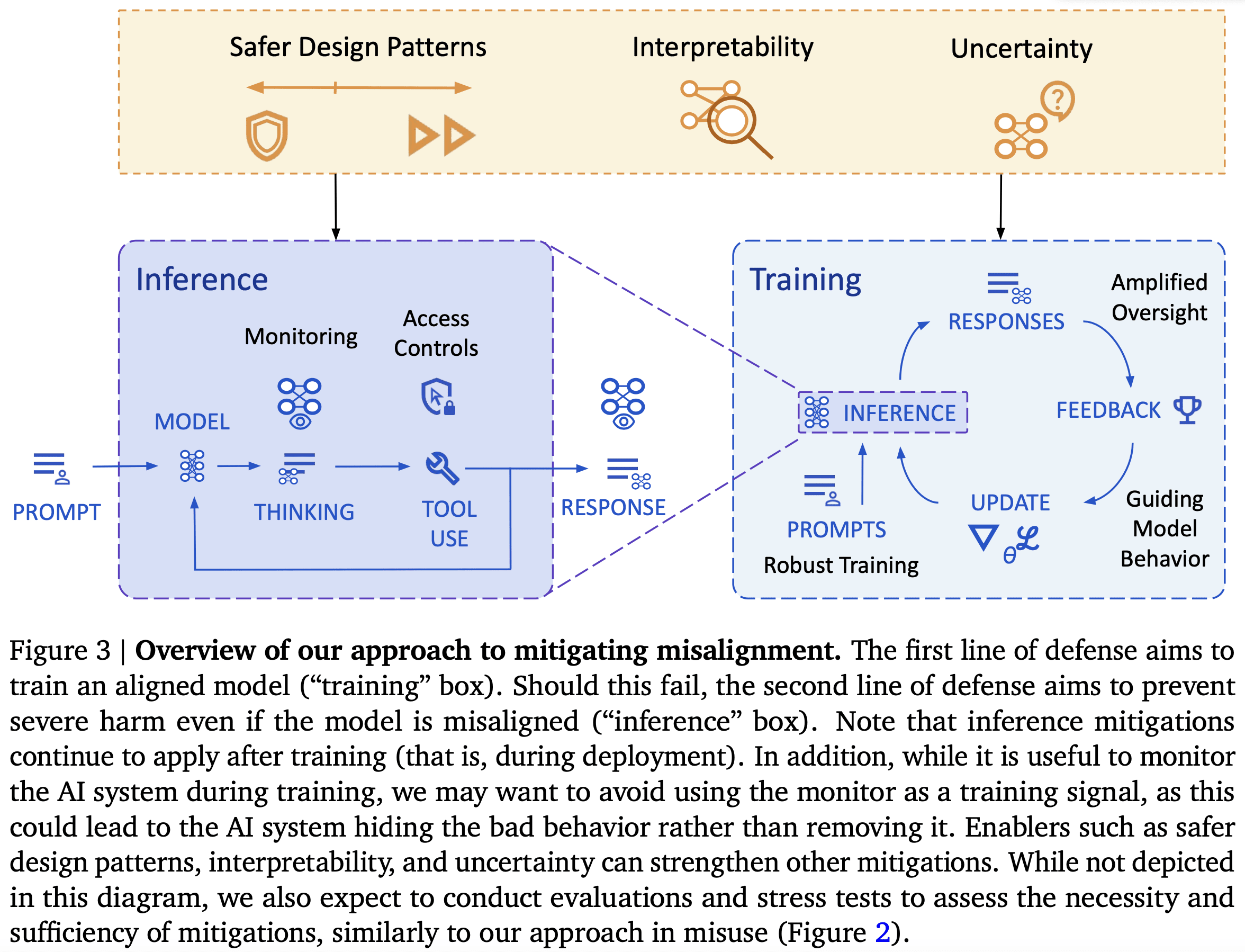 Our approach has two lines of defense. First, we aim to use model level mitigations to ensure the model does not pursue misaligned goals. We follow the standard ML playbook: (1) improve the ability to get good oversight (amplified oversight), (2) use this to improve the model (guiding model behavior), and (3) figure out where oversight is needed to train a model that will robustly do what we want (robust training).