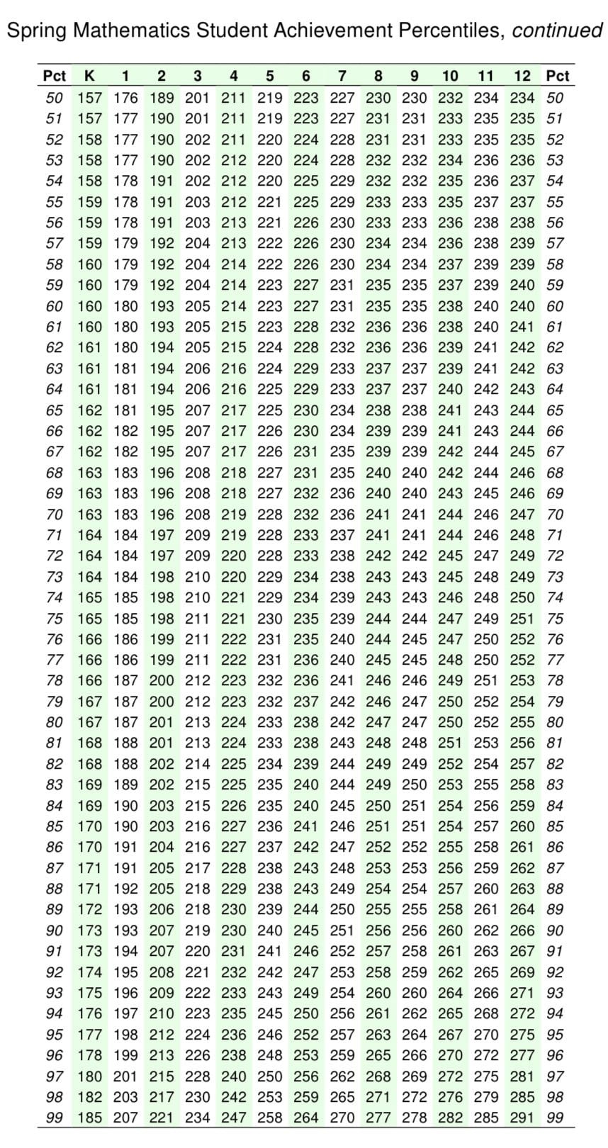 Is are children learning? In high school math, the answer seems to be no. The 50th percentile student gets a 230 in 8th grade on this test, and then a 234 in 12th (a second source said 232→237, but that’s the same thing), and we know from the higher percentiles that the test is not being saturated here. Note that reading scores only increased 5 points, from 224→229.