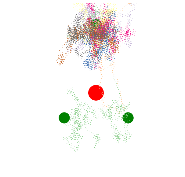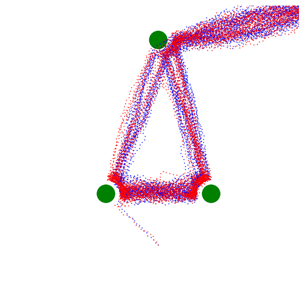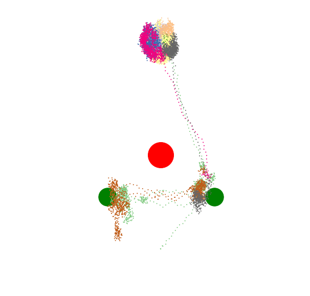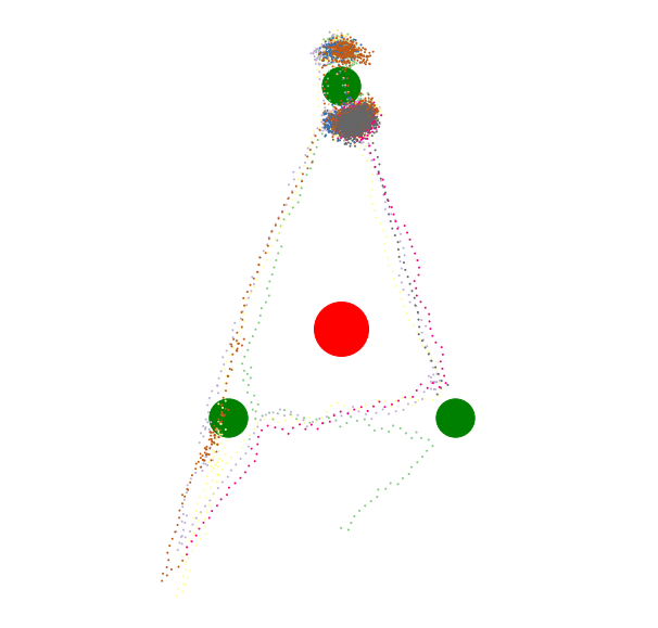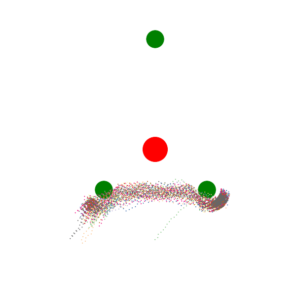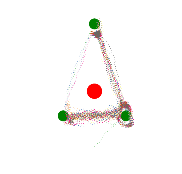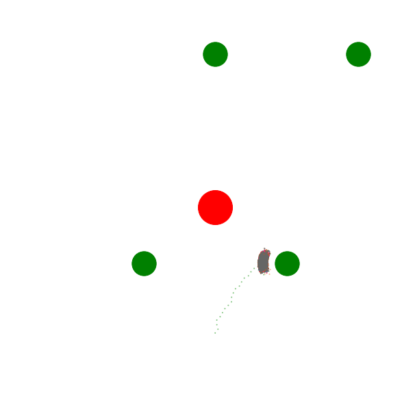 In this image, the path of the agent is painted with points, the color of the points changing slowly with the passage of time. This agent possesses three subagents with preferences for reaching the three green circles, and a fourth mild preference for avoiding the red circle.