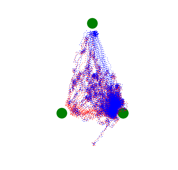 With more modest preference for the company of other agents, and with partially-overlapping goals (Blue agent wants to spend time around the top and rightmost target, Red agent wants to spend time around the top and leftmost target) you get this other piece of art that I call “Healthy Friendship”. It looks like they’re having fun, doesn’t it?