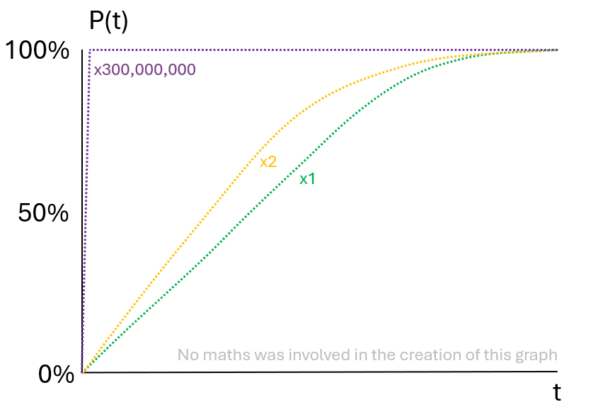 If an event has an n > 0 probability of occurring over a period of time P(t), then the probability of that event having occurred over increasingly long time periods will eventually approach 100% (the green line in the graph). Additionally, the probability of an event occurring increases proportionally to the number of actors who are capable of initiating that event (as indicated by the other two lines in the graph). A galactic civilisation with hundreds of millions of independent star systems will be doomed relatively quickly by a correlated x-risk. This graph is adapted from a talk that Toby Ord gave at EAG London 2025 on forecasting over long time periods: