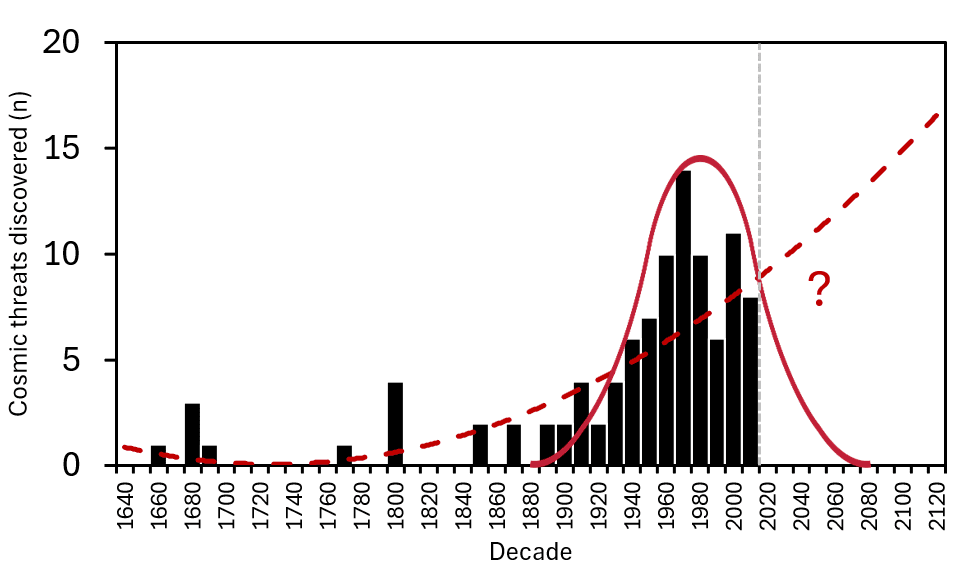 Figuring out how many unknown unkowns there are is really hard. The sample size of galactic x-risks isn’t really big enough to say anything confidently about a rate of discovery, especially since I don’t know which are actually real. So I’ve listed 100 cosmic threats[60] (anything arising from space that could destroy Earth as a proxy for galactic existential risks), summed up how many were discovered in each decade, and plotted that on a bar graph[61]:
