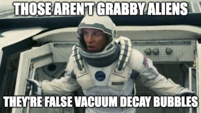 I hinted at this in the ‘conflict with alien intelligence’ section. I have suggested that galactic x-risks are real and could destroy a spacefaring civilisation of arbitrarily large size. I then argued that the probability of one of those risks occurring is extremely high. So if aliens exist at the same time as us (especially under a grabby aliens scenario), then the probability that they will initiate an x-risk that would affect us is also very high, whether intentionally or not. There might already be vacuum decay bubbles headed our way, so human civilisation would end even if we did everything right. In addition to concerns I’m raising about the resilience of our future galactic civilisation, I think aliens have big implications for discussions around big picture cause prioritisation[68].