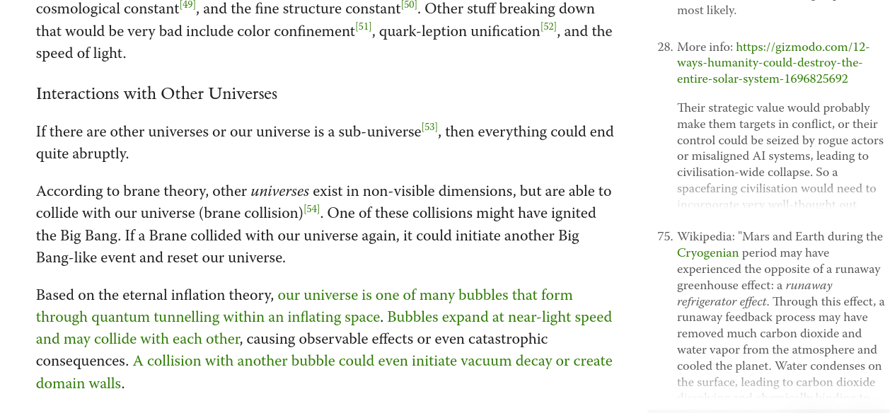 There are so many different fundamental constants and properties that are highly precise and necessary to the existence of life. With extremely developed physics and arbitrarily advanced technology, if any of them are possible to alter at a large scale, then life in the universe is at risk. Additionally, it has been suggested that fundamental constants may drift over time in accordance with the age of the universe. The fundamental constants include the gravitational constant[46], strong coupling constant[47], Planck’s constant[48], the cosmological constant[49], and the fine structure constant[50]. Other stuff breaking down that would be very bad include color confinement[51], quark-leption unification[52], and the speed of light.