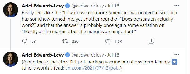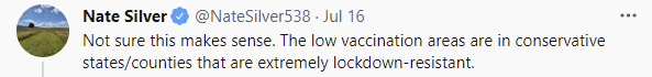 The good news is that we are seeing more Republicans stepping up and telling their constituents to get vaccinated. That, combined with the threat from Delta, should help, despite the efforts of the Ministry of Truth. More discussion in that section.