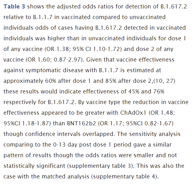 A comment last week pointed to this study of vaccine effectiveness against Delta. I believe it had already been incorporated into the claims assessed last week, but good to explicitly note the primary source. I’m reproducing the bottom-line sections in full, skip if you don’t want to dive into the details.