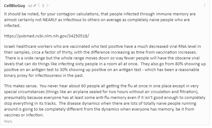 You don’t really address the dosing controversy on vaccine efficacy, except mentioning that you think it’s dumb to worry about, but there is something potentially concerning there. There’s some evidence that the dosing interval is causing some differences between the vaccine efficacies reported in Israel and the UK. This discussion full of immunology science words I don’t understand says there is a measurable difference in response to delta for short vs long doses.